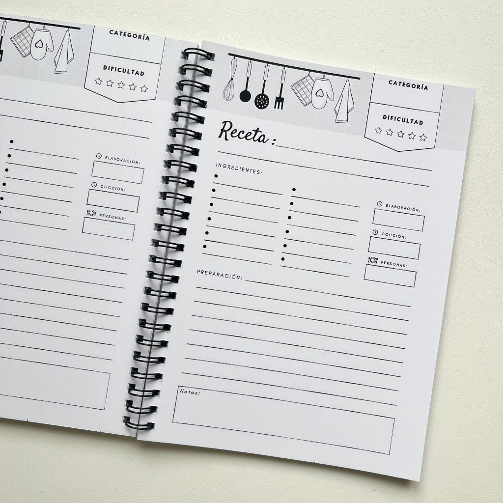 Cada cuaderno está diseñado con páginas específicas para que puedas detallar cada receta de una manera fácil y ordenada. Tendrás apartados para apuntar la categoría, dificultad, ingredientes, tiempo de elaboración y cocción, número de personas, cualquier nota adicional…