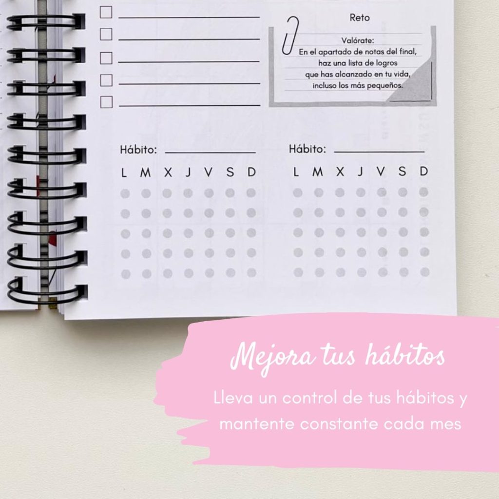 - Incorpora buenos hábitos y mejora tu estilo de vida. Cada mes, tendrás un espacio para apuntar y llevar un control de 2 hábitos concretos. Ve marcando tu progreso para verlo y así motivarte a ser constante.