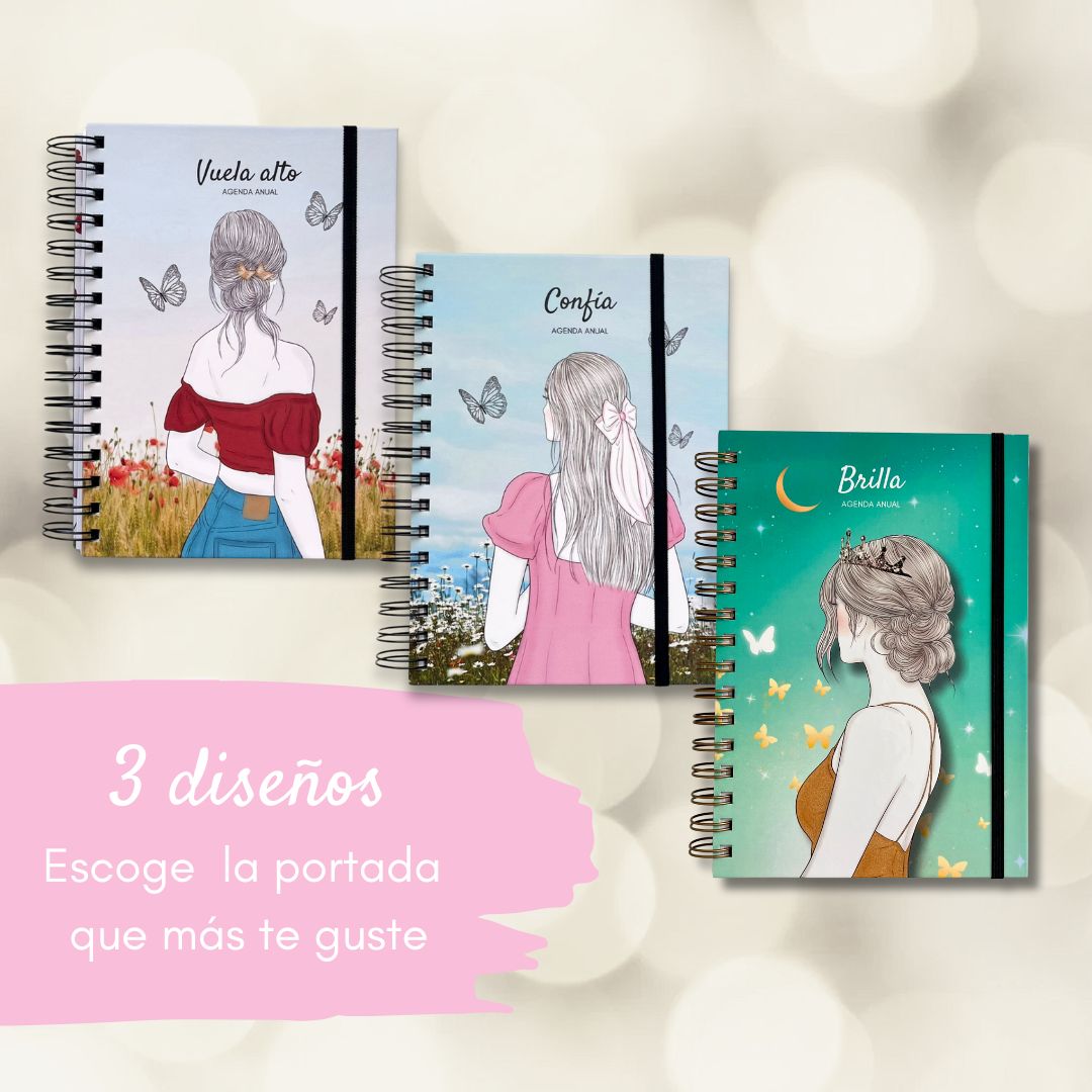 - Escoge tu portada favorita. Tienes tres modelos de agendas para escoger la que más vaya contigo. La esencia de ambas es igual, lo que más cambia en cada una son las ilustraciones de su interior.