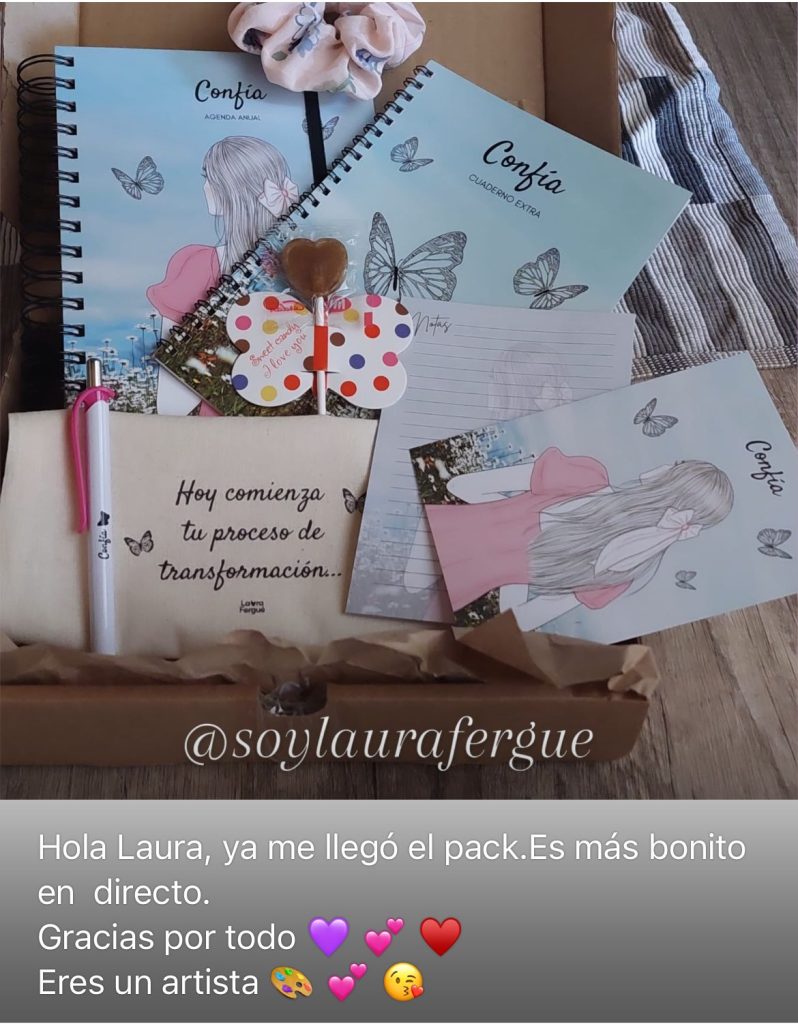 Este pack incluye además, un cuaderno con muchos extras para completar tu agenda, un bloc de notas compañero, un bolígrafo, una bolsa de tela, una cajita personalizada con tu nombre, guía para utilizar tu agenda, regalo sorpresa y el 💥 ENVÍO GRATIS (España península).