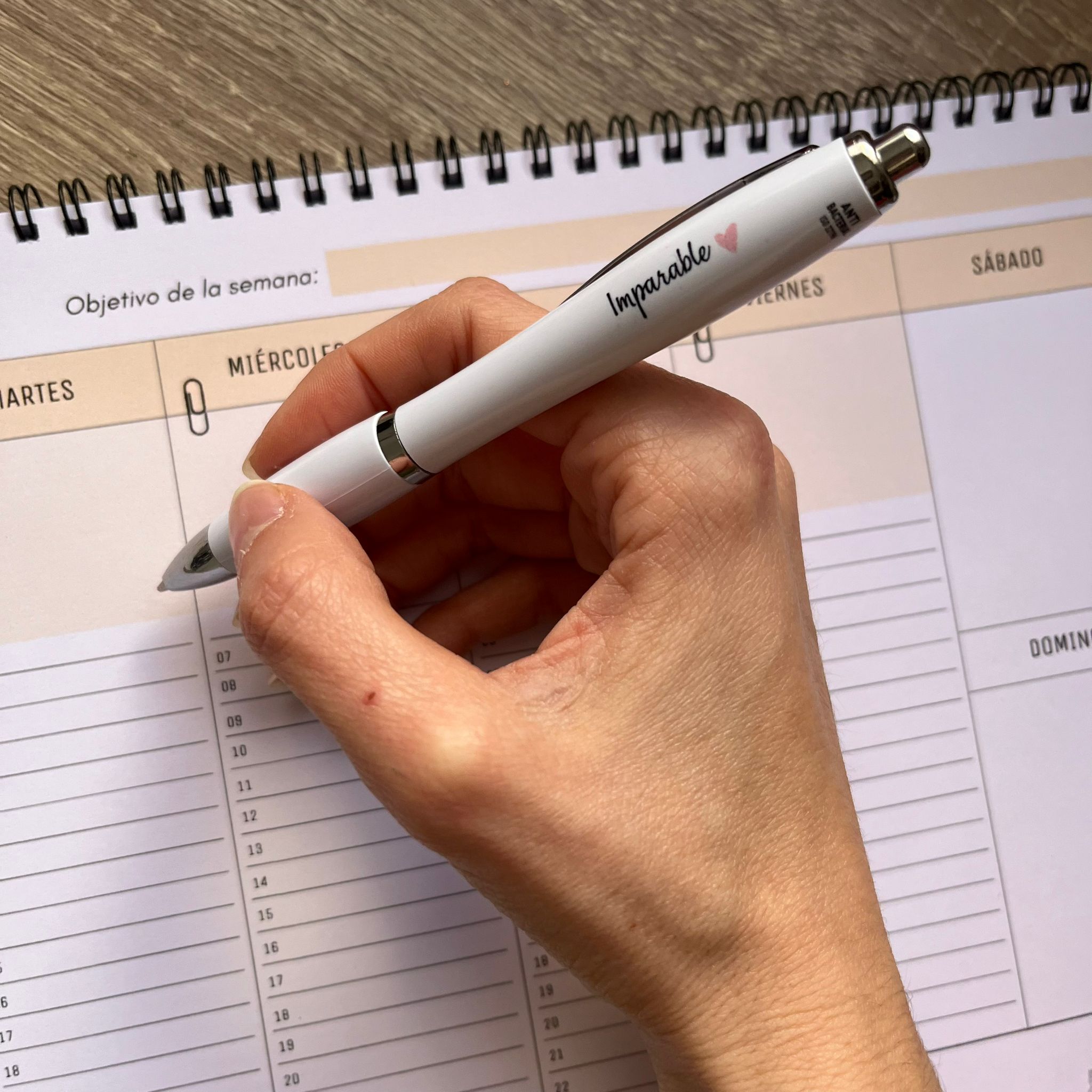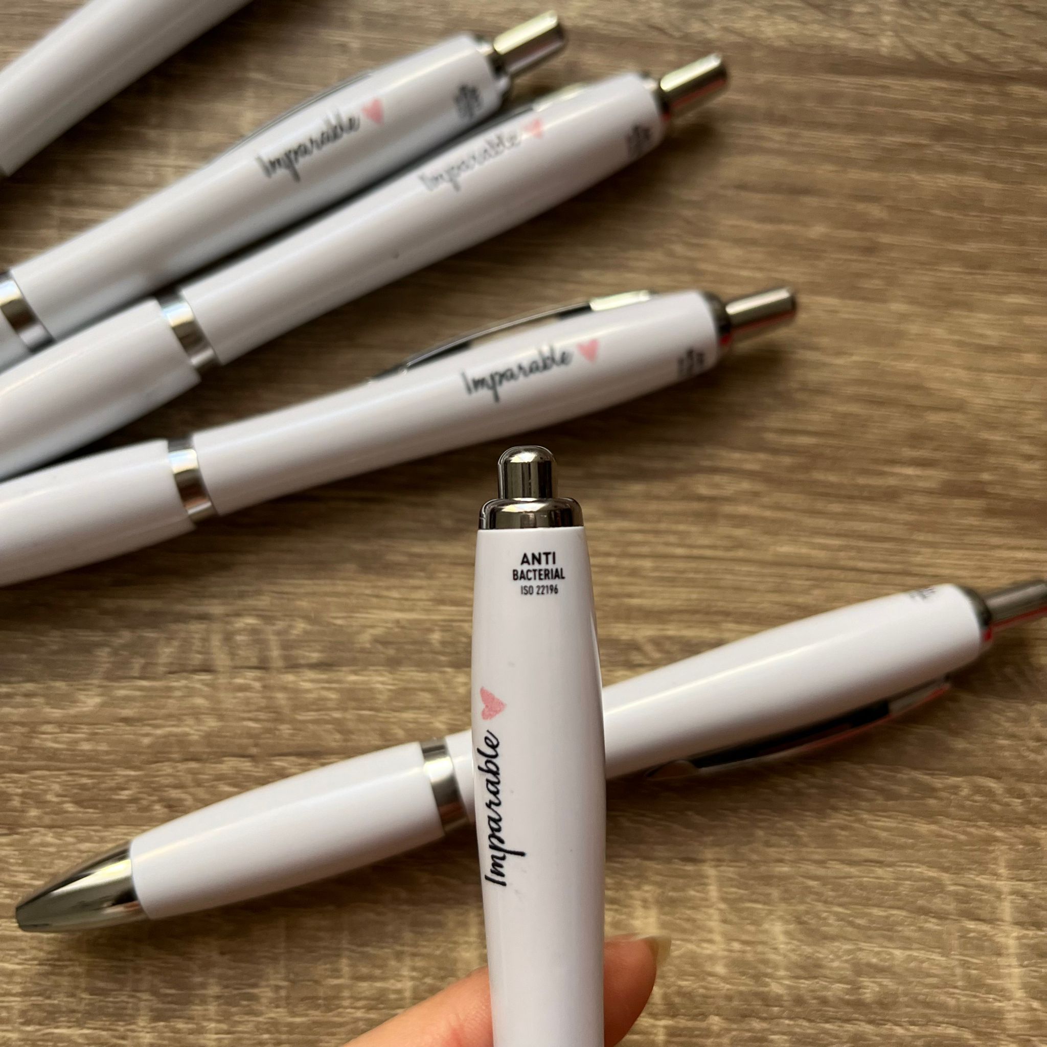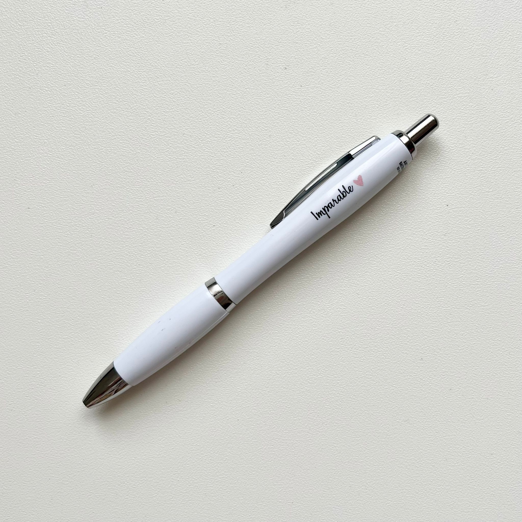 Bolígrafo elegante y minimalista, blanco con detalles en plateado. Grabado el lema ‘Imparable’ y su corazoncito rosa. Para que te acompañe en tus estudios, reuniones, clases, trabajo… y deje bien claro que eres del club de las que no se rinden 🥰